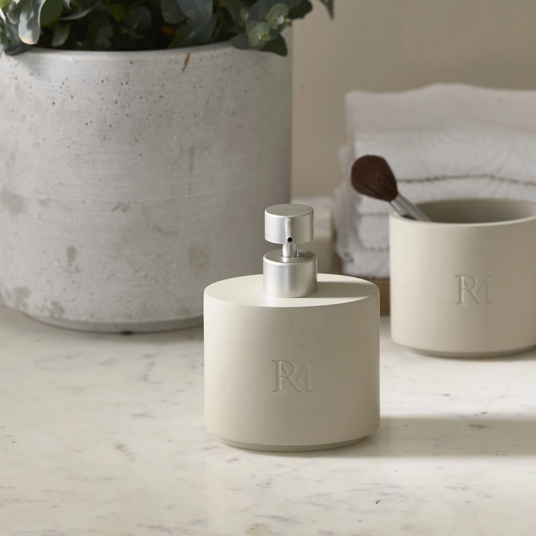 De dispenser is vervaardigd uit licht leverkleurige hars en afgewerkt met een matte roestvrijstalen pomp. Het nieuwe RM-monogram, bestaande uit sierlijk in elkaar verweven letters, geeft het geheel een exclusieve en tijdloze uitstraling. Combineer met de bijpassende tandenborstelhouder uit dezelfde Monogram-serie voor een harmonieus geheel.