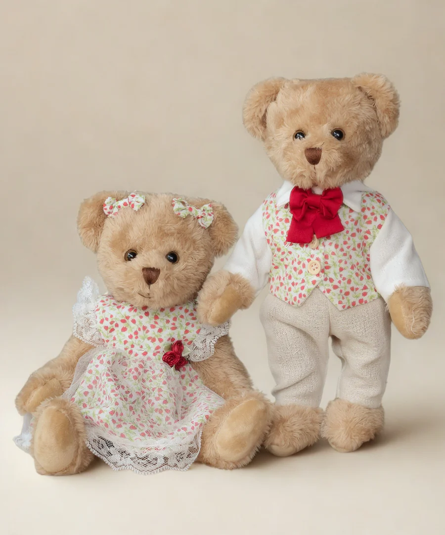 Dit beerkoppel is pure schattigheid in een doosje! De dame straalt in haar charmante bloemetjesjurk en schattige strikjes, terwijl de heer elegant is gekleed in zijn stijlvolle bloemetjesjasje en strik. Gemaakt van superzacht pluche, zijn deze beren niet alleen prachtig als decoratie in de woonkamer of kinderkamer, maar ook heerlijk zacht om mee te knuffelen. Een uniek Limited Edition duo dat alleen als set verkrijgbaar is – perfect als romantisch cadeau, sfeermaker of knuffelvriendjes voor de kleintjes.