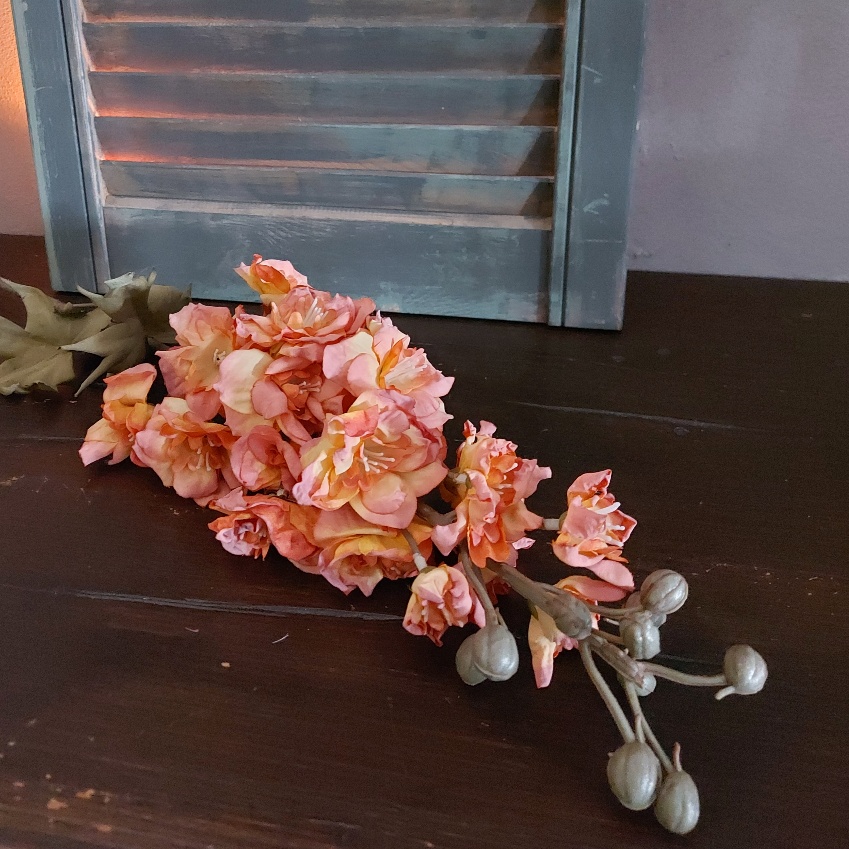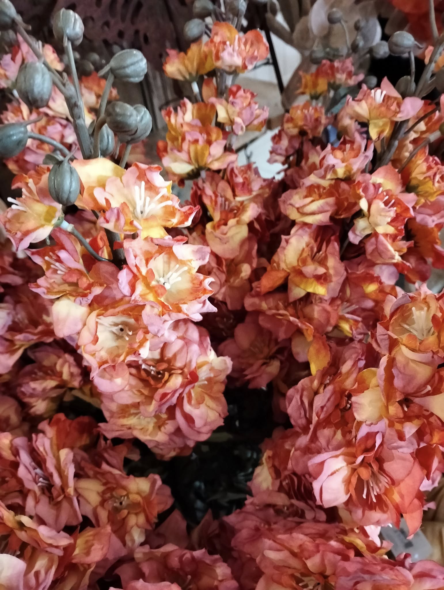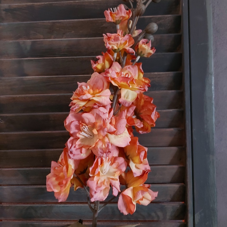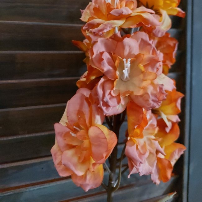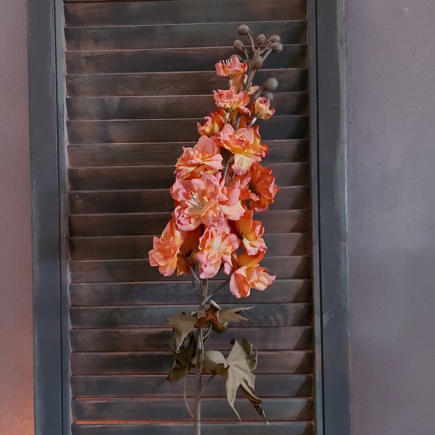 De Brynxz Ridderspoor, ook wel Delphinium Copper, is een prachtige kunstbloem met een volle bloemtros in warme koper- en oranje tinten. Dankzij de rijke kleur en realistische vormgeving is deze zijden bloem perfect voor het samenstellen van een weelderig plukboeket of als statement piece in een robuuste vaas.