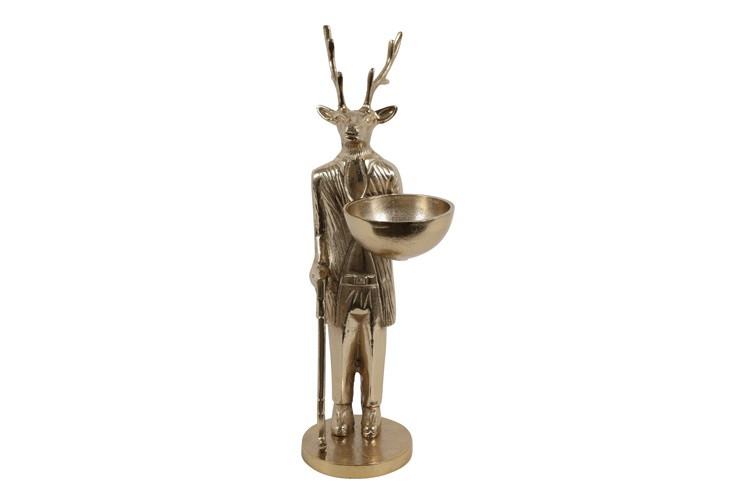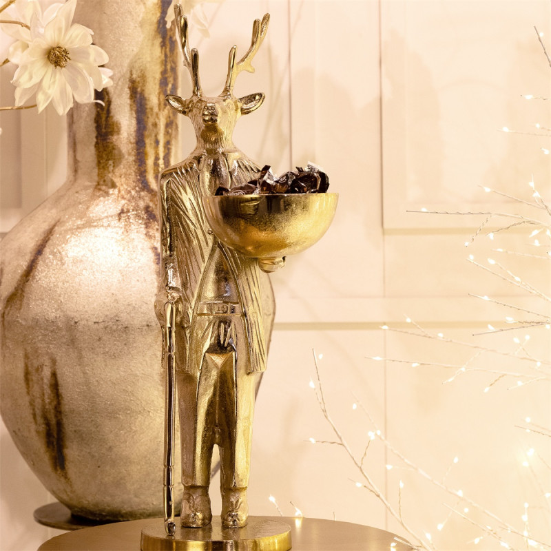 Dit stijlvolle staande hert met schaal van Countryfield is een elegante eyecatcher voor je interieur. Uitgevoerd in glanzend goud en vervaardigd uit stevig metaal, combineert het beeld een luxe uitstraling met praktische functionaliteit. De schaal kan gebruikt worden om kaarsen, decoratieve objecten of kleine accessoires sfeervol te presenteren.