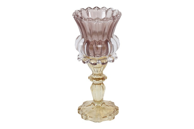 Breng sfeer en stijl in huis met deze elegante theelichthouder op voet in warme lichtbruine/gele tinten. Vervaardigd uit hoogwaardig glas, verspreidt hij een zachte, warme gloed wanneer het kaarslicht brandt.