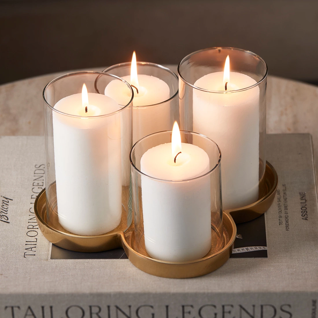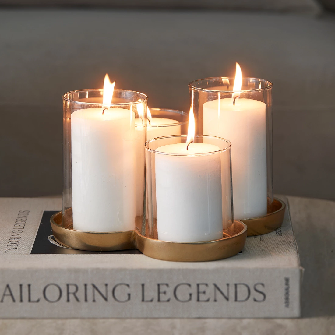 Het Lionas windlicht is een elegante blikvanger die direct sfeer en luxe toevoegt aan je interieur. Het stijlvolle gouden plateau vormt een chique basis voor de vier glazen kokers, waarin het kaarslicht prachtig wordt weerkaatst en een warme, uitnodigende gloed verspreidt.