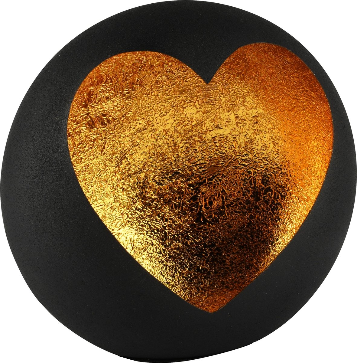 Elegante, bolvormige theelichthouder met een uitgesneden hartvorm. De combinatie van zwarte buitenkant en gouden binnenzijde creëert een warme, sfeervolle gloed bij het branden van een theelichtje of LED theelicht.