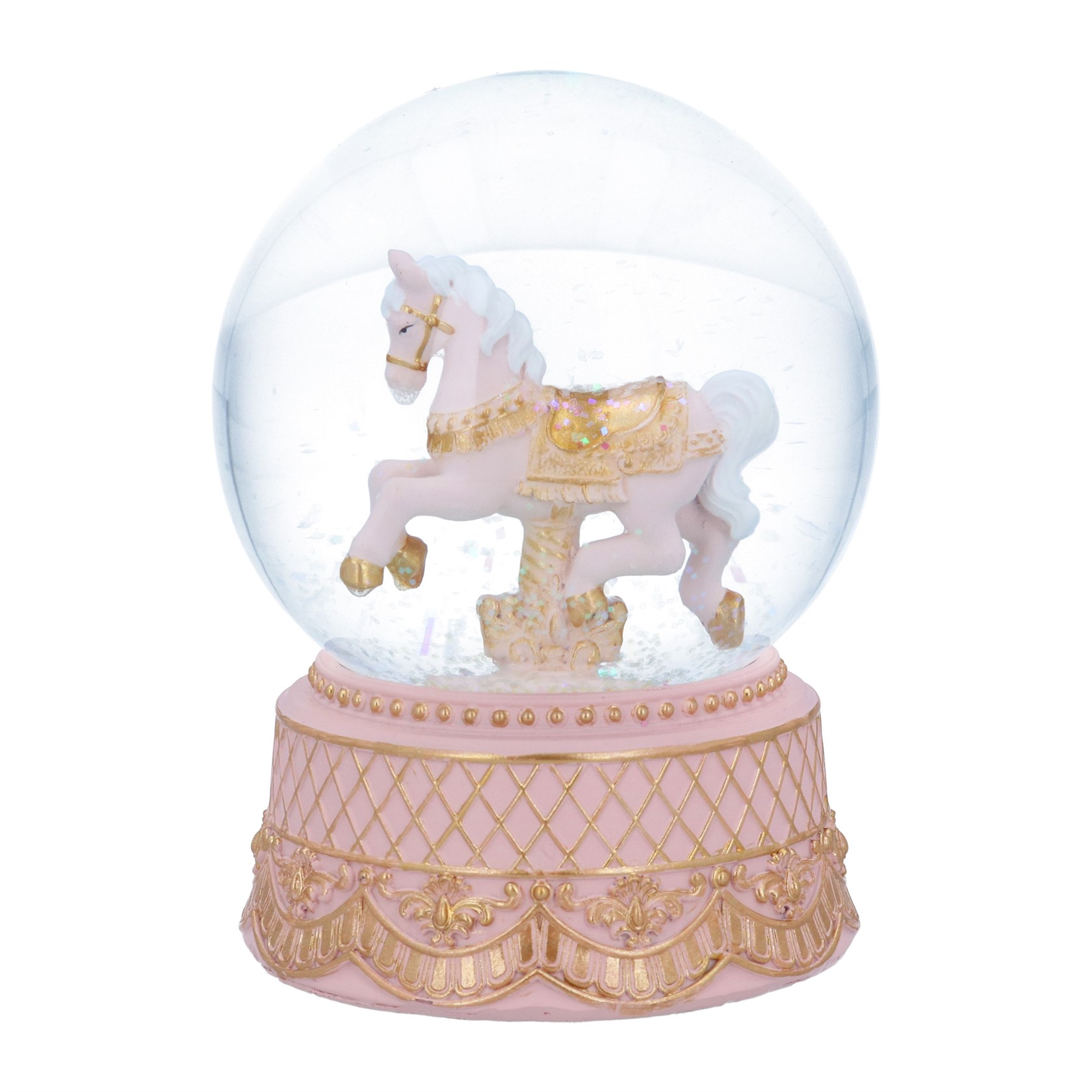 Deze luxe muziekbol van Gisela Graham combineert de charme van een sneeuwbol met de magie van een muziekdoos. Binnenin staat een elegant paard in roze en goud, omringd door fonkelende sneeuwvlokjes. Wanneer de bol wordt opgewonden, speelt hij het klassieke kerstlied Jingle Bells, waardoor een sprookjesachtige kerstsfeer ontstaat.