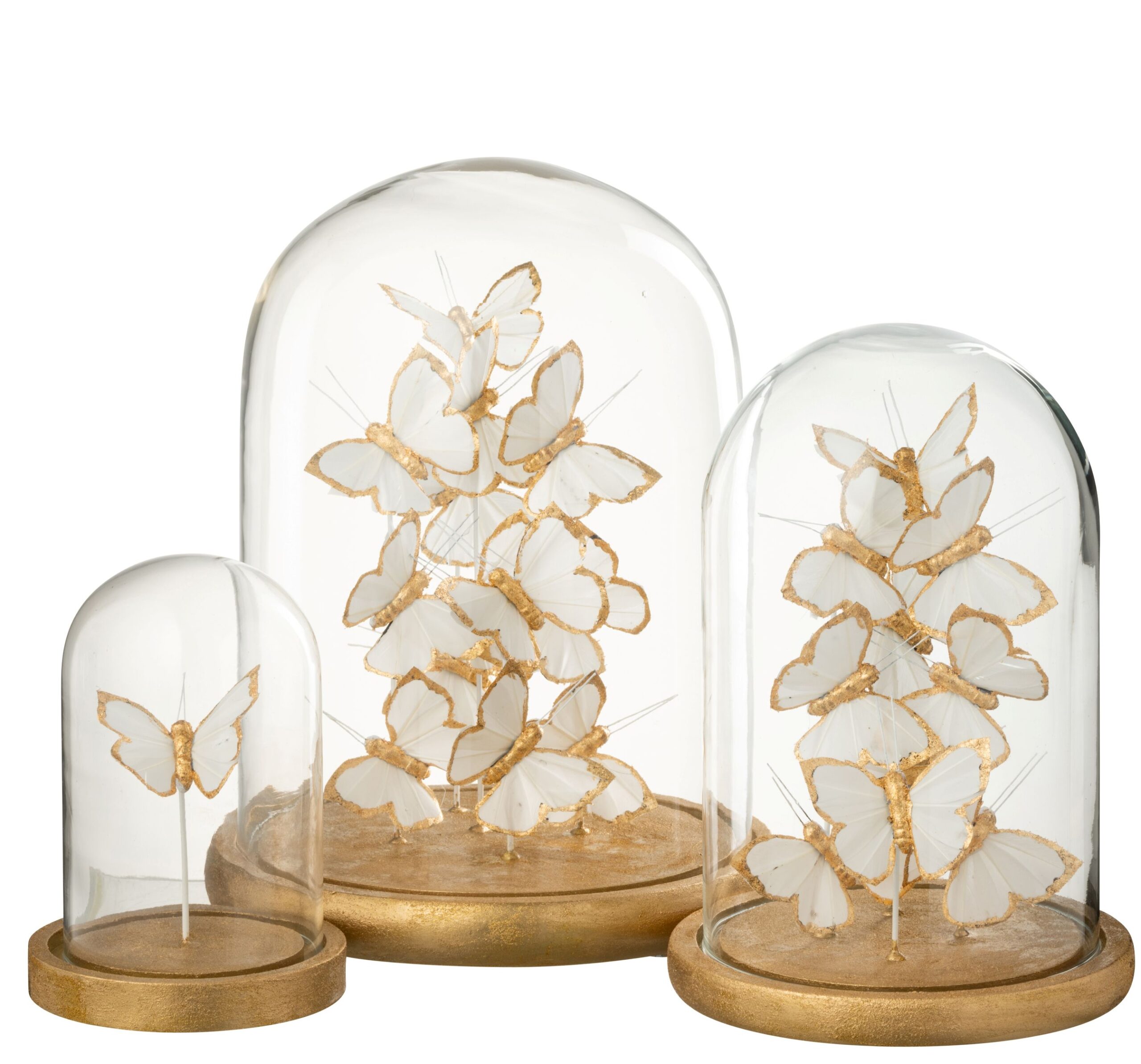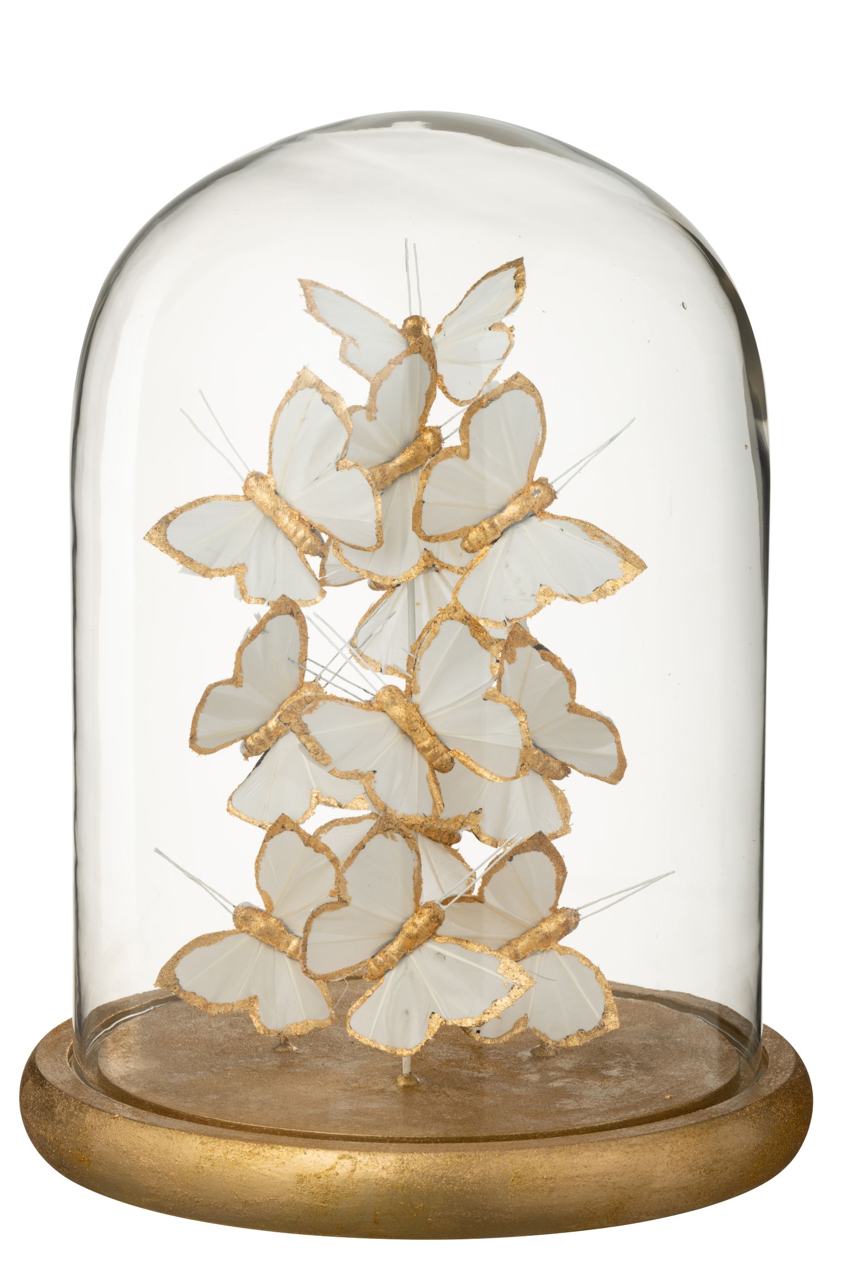 Breng een vleugje elegantie in je interieur met deze decoratieve stolp van J-Line. De stolp in glas wordt afgewerkt in een stijlvol wit en goudkleurig design en is gevuld met fijne vlinders die zorgen voor een luchtige en luxueuze uitstraling. Perfect om op een dressoir, bijzettafel of in een vitrinekast te plaatsen en zo een sfeervol accent toe te voegen aan je woondecoratie.