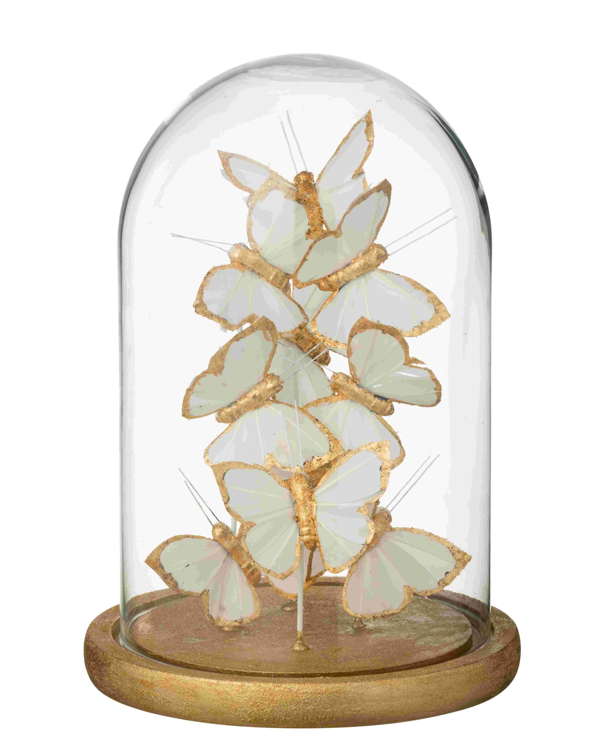 Breng een vleugje elegantie in je interieur met deze decoratieve stolp van J-Line. De stolp in glas wordt afgewerkt in een stijlvol wit en goudkleurig design en is gevuld met fijne vlinders die zorgen voor een luchtige en luxueuze uitstraling. Perfect om op een dressoir, bijzettafel of in een vitrinekast te plaatsen en zo een sfeervol accent toe te voegen aan je woondecoratie.