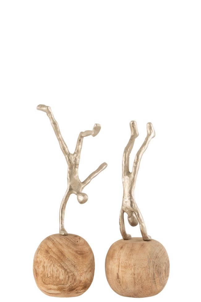 J-line Figuur in handenstand Op Voet Aluminium/Hout Naturel/Zilver, 2verschillende/priojs per stuk – 15x11x30 cm