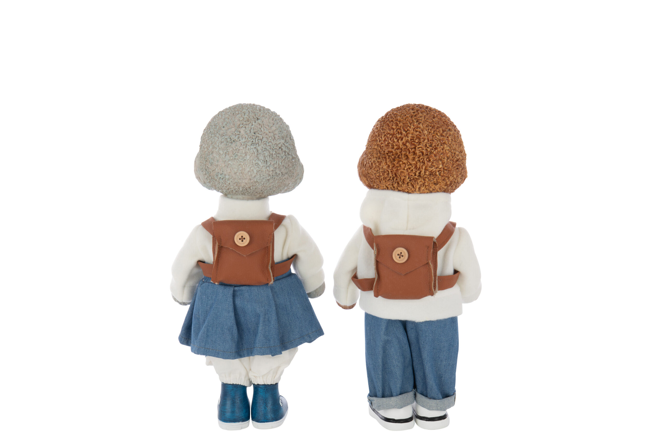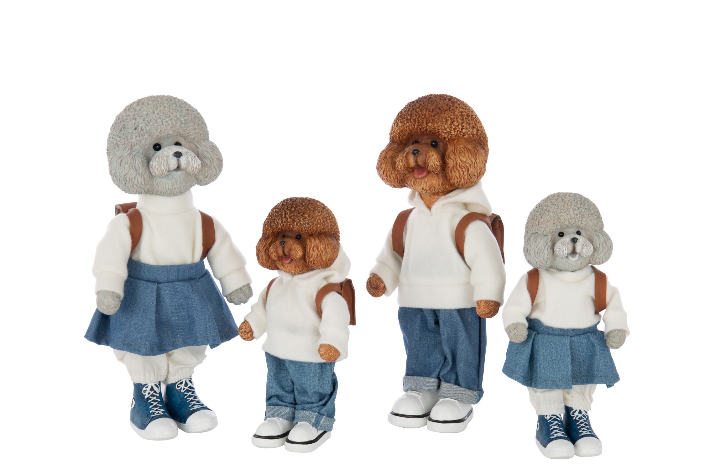 Charmante decoratieve poedelfiguren in kunsthars, verkrijgbaar als jongen of meisje. Elk figuurtje draagt een schattige outfit (kleedje of broek) en een rugzakje op de rug. Dankzij het meerkleurige ontwerp vormen ze een speels en stijlvol accent in elk interieur.