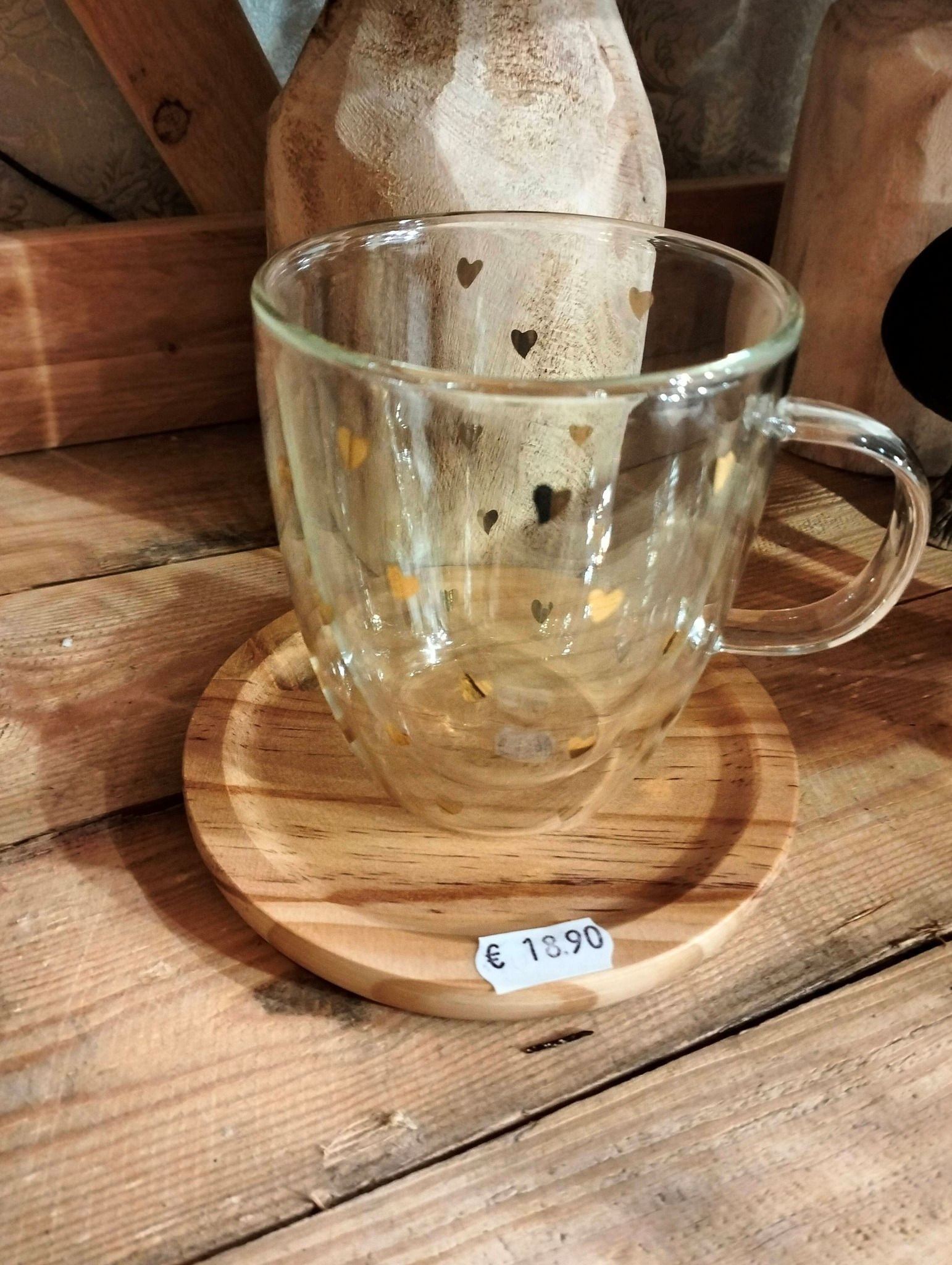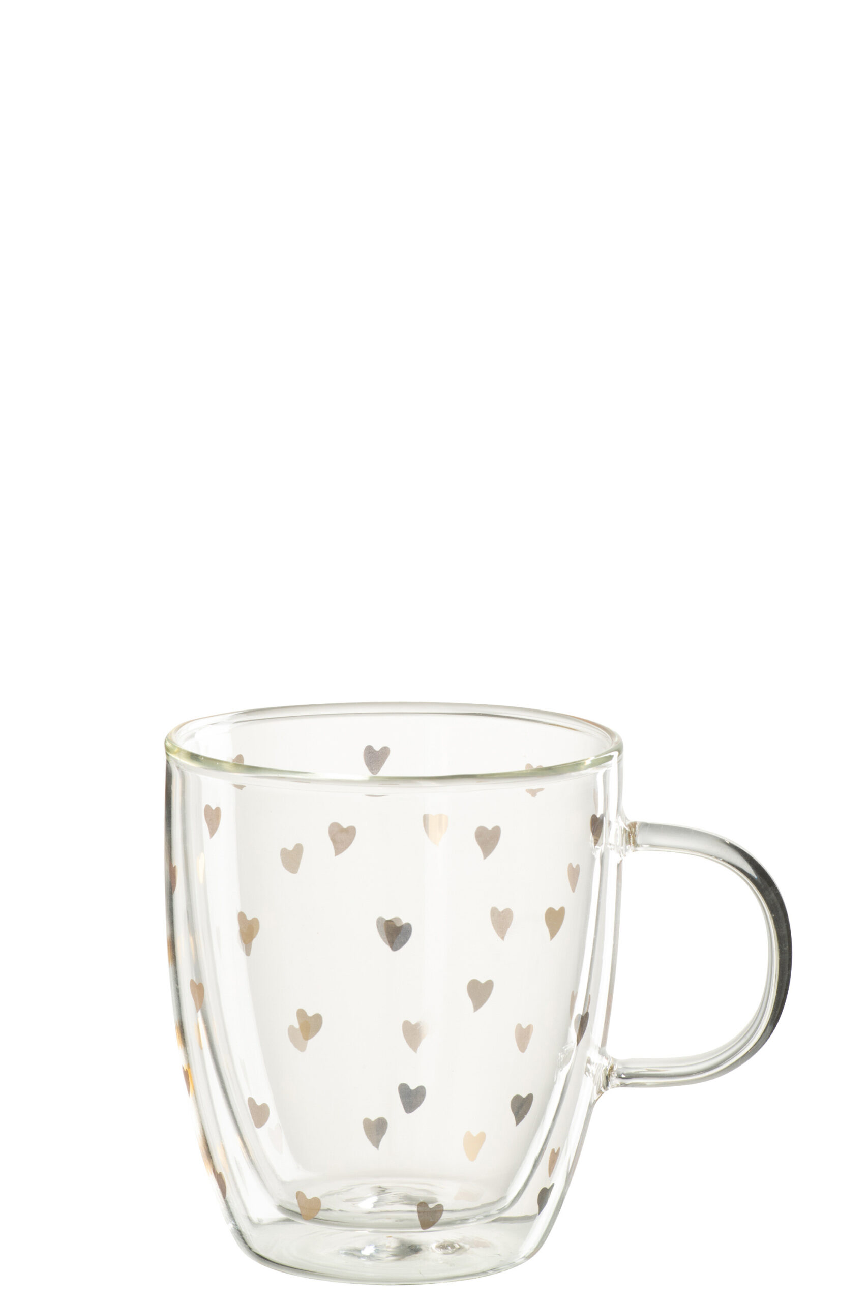 Deze charmante glazen tas, gepresenteerd op een stijlvolle houten schaal, is een echte blikvanger in elke ruimte. Het transparante glas met subtiele gouden hartjesmotief zorgt voor een elegante en speelse uitstraling. Perfect als decoratief item, om kleine snoepjes of accessoires in te presenteren, of simpelweg als sfeervolle toevoeging aan je interieur.