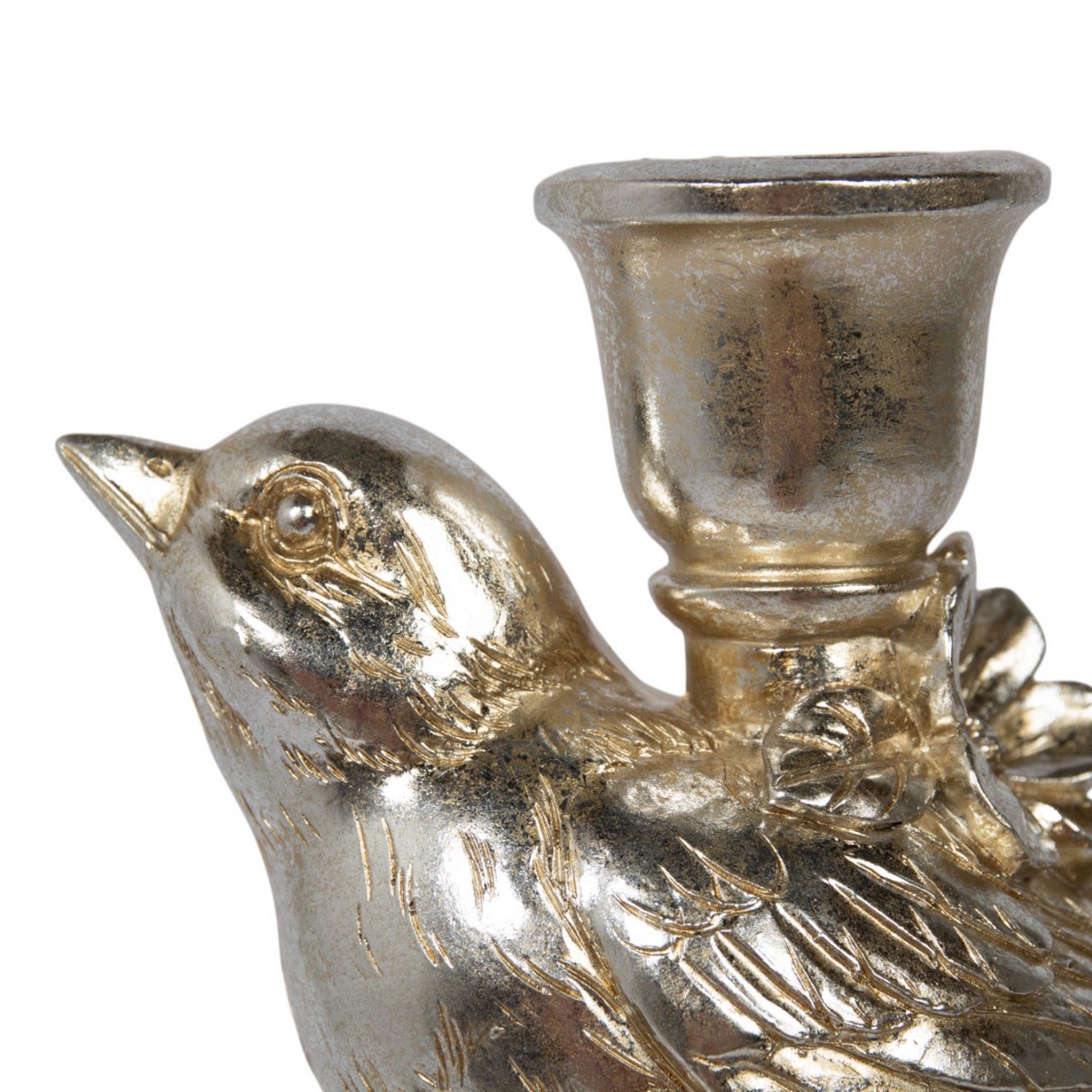 Deze kaarsenhouder met vogel- en bloemdecoratie van Mars & More is een elegant en sfeervol woonaccessoire. De zilverkleurige afwerking in kunsthars geeft de houder een stijlvolle uitstraling, terwijl de vogel en bloem een speels en decoratief accent toevoegen.