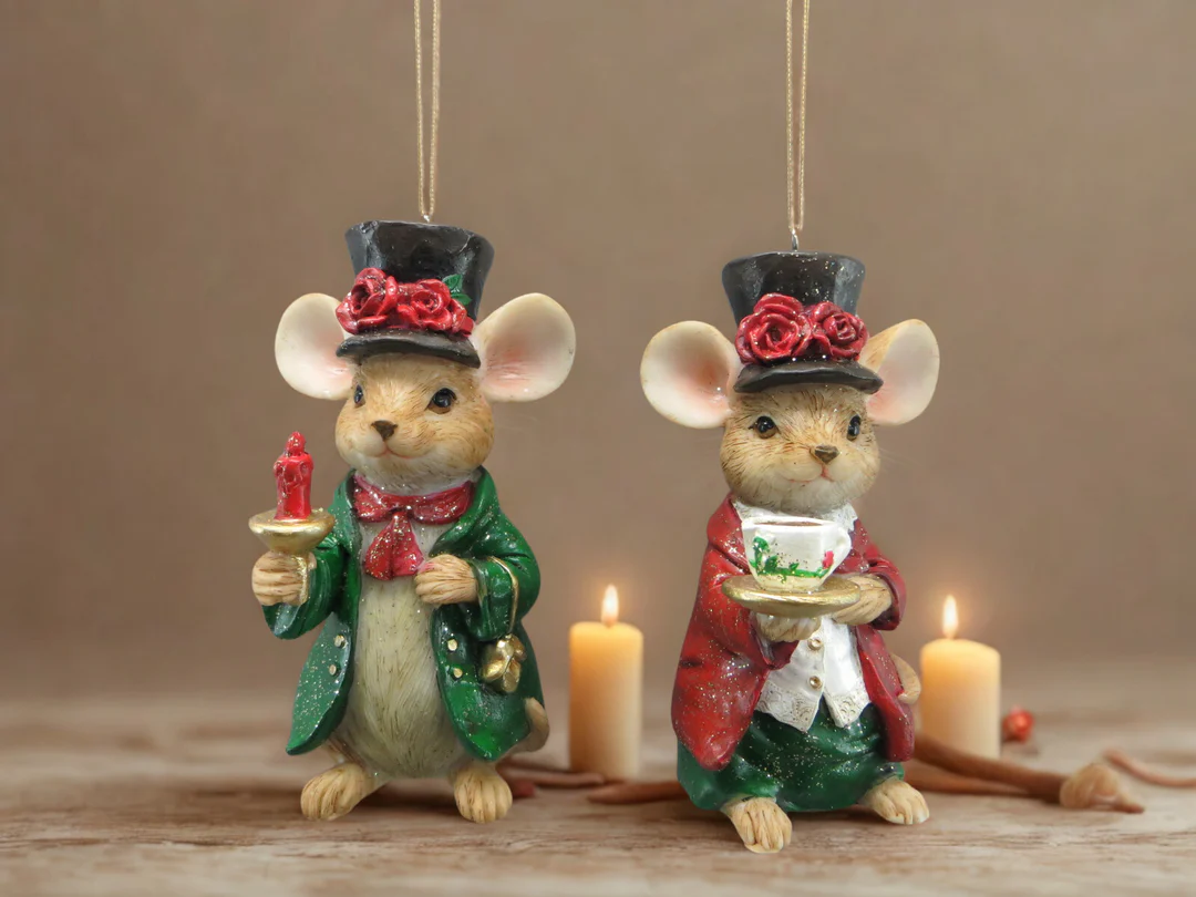 Lieve kersthangertjes van La Galleria, bestaande uit een koppel muisjes met hoed.