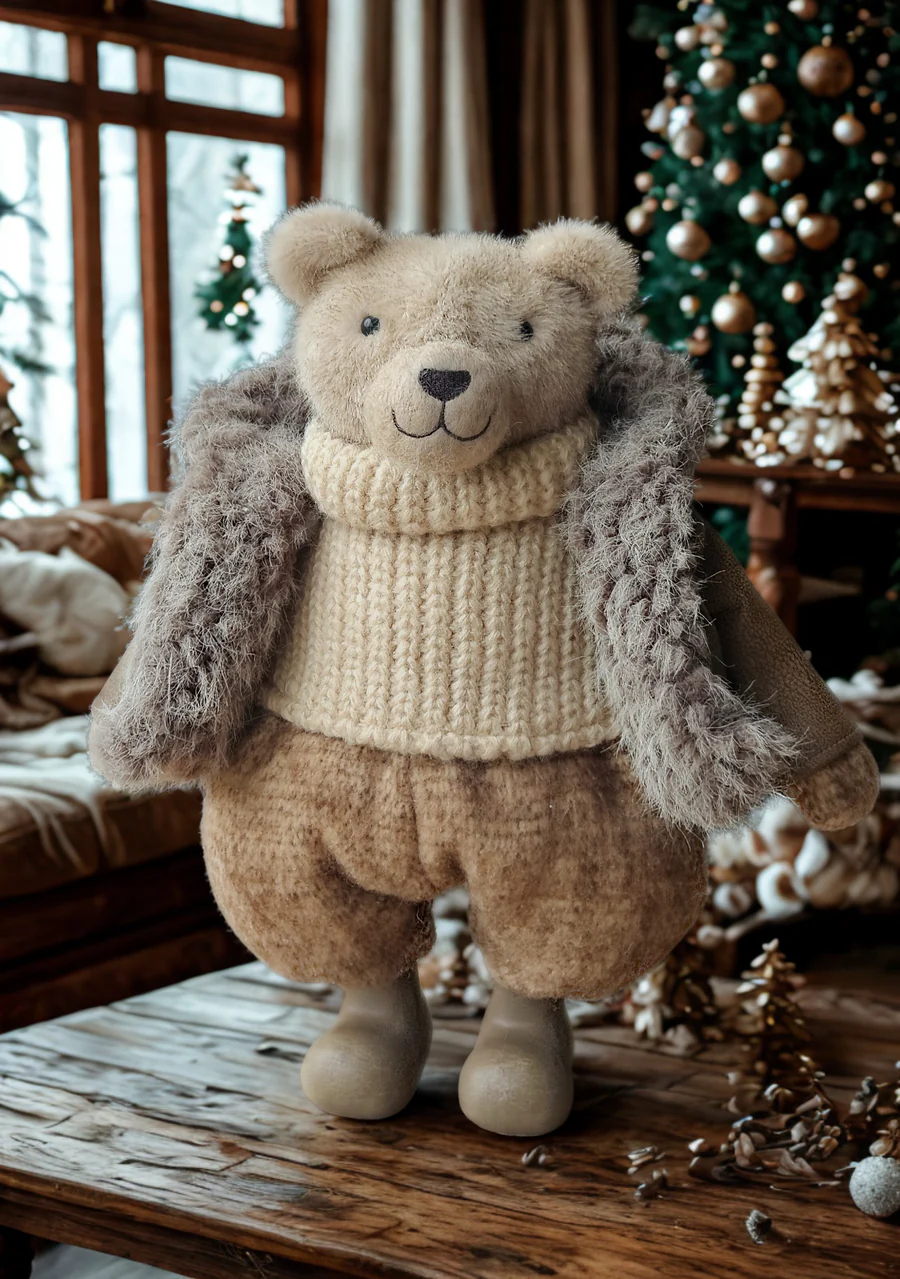Deze schattige staande beer van La Galleria brengt warmte en gezelligheid in je interieur. De beer draagt een beige coltrui, een wollen vest met bontafwerking in het grijs en een bruine broek. Zijn zachte uitstraling en warme kleuren maken hem ideaal om je kerstinterieur of kinderkamer op te fleuren.