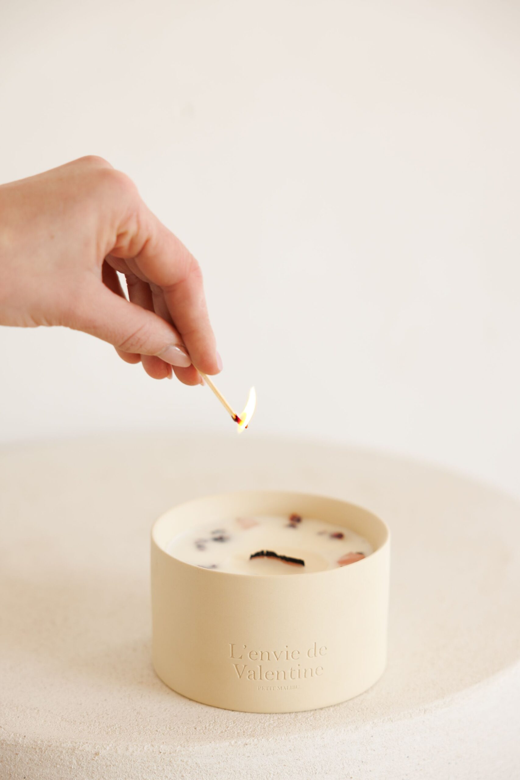 Deze geurkaars bevatten de roze quartz, dit is de kristal van de liefde. Ze brengt rust en bevorderd vriendschappen, de steen helpt tegen angsten.