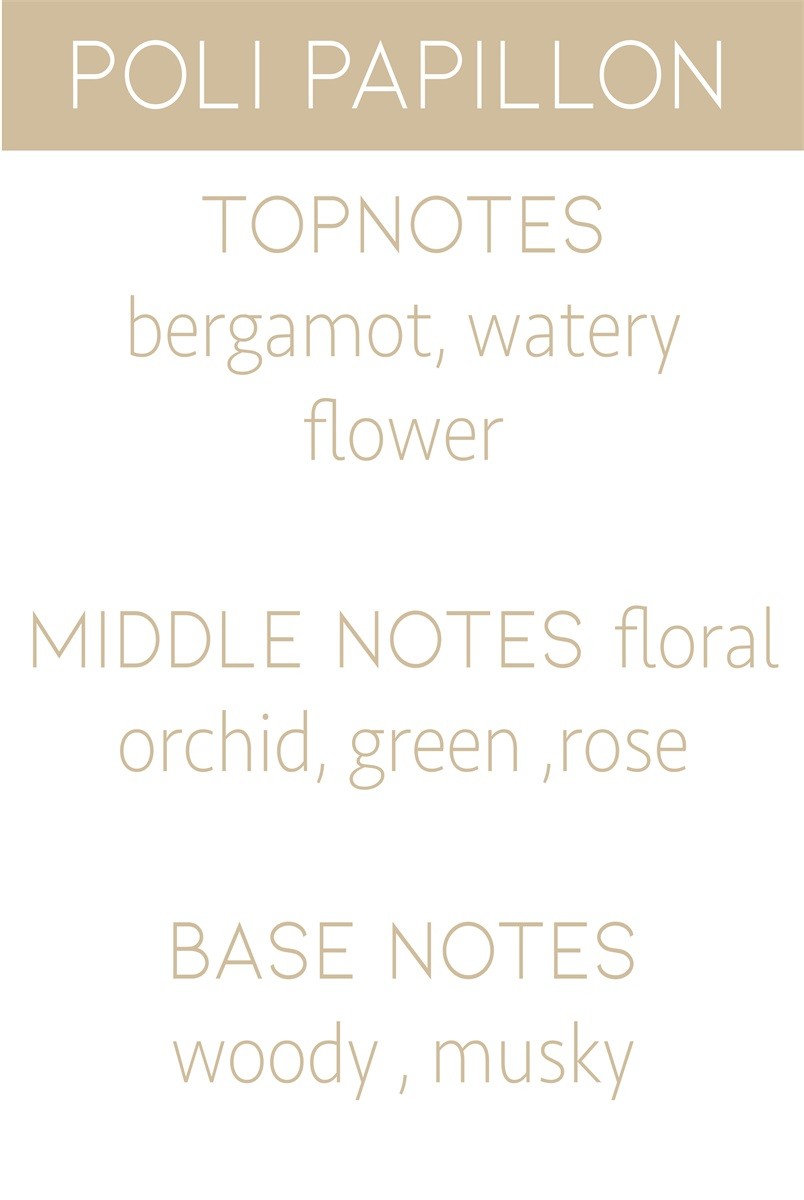 Poli Papillon is een elegante en verfijnde geur die frisheid en zachtheid perfect combineert. De sprankelende opening van bergamot en watery flower maakt plaats voor een bloemig hart van orchidee, groene nuances en roos. Een warme basis van hout en musk zorgt voor een subtiele, blijvende verfijning.