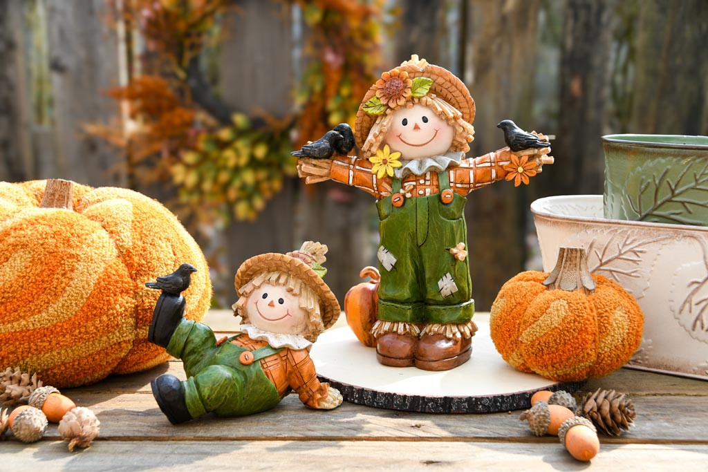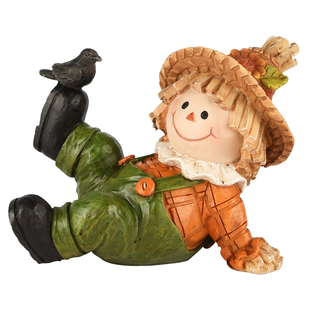 Een speelse toevoeging aan je herfstdecor! Deze liggende vogelverschrikker met een schattig vogeltje straalt een vrolijke, landelijke charme uit. De warme groentinten en gedetailleerde afwerking in kunsthars maken dit figuurtje tot een gezellig seizoensaccent.