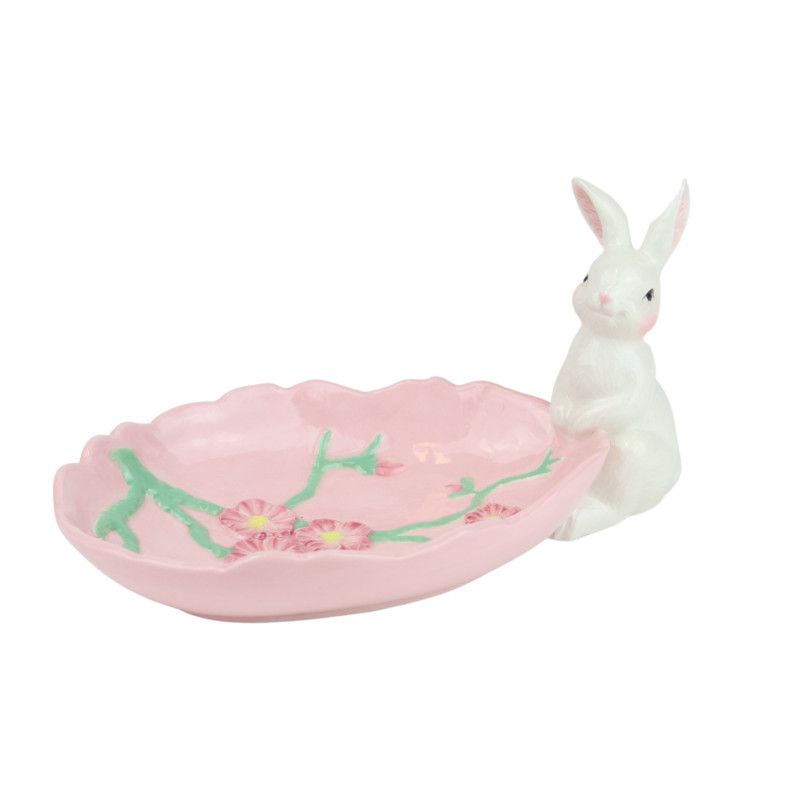 paasdecoratie – goodwill – Konijntje met bordje – keramiek – roze/wit – H 19 cm