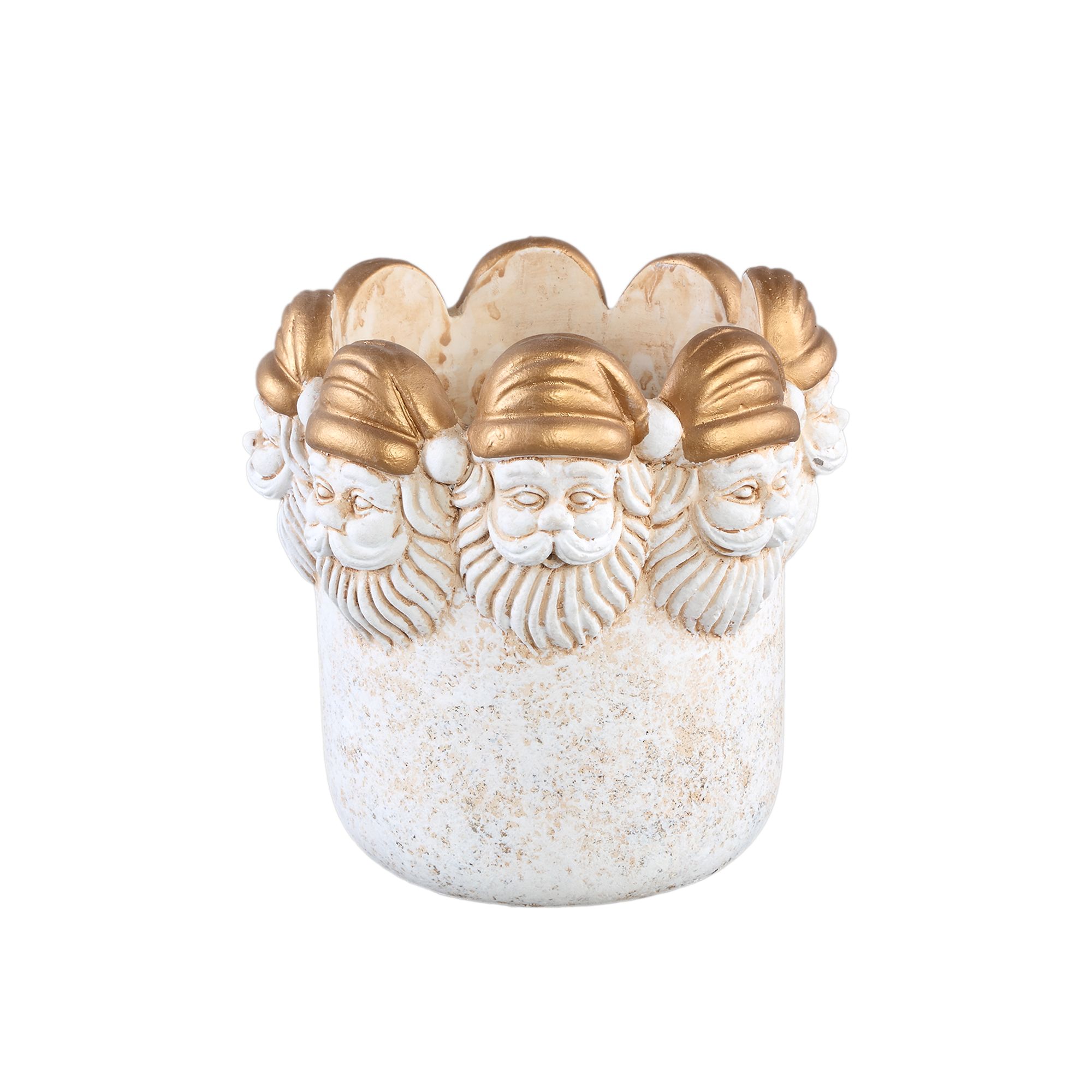 De PTMD Santi cementpot in goud/beige is een feestelijke en veelzijdige toevoeging aan je interieur of tuin. De rand met kerstmanhoofden geeft deze pot een speels en stijlvol karakter, ideaal om tijdens de feestdagen extra warmte te brengen. Perfect om een theelicht, een kerstroos of andere planten in te plaatsen.