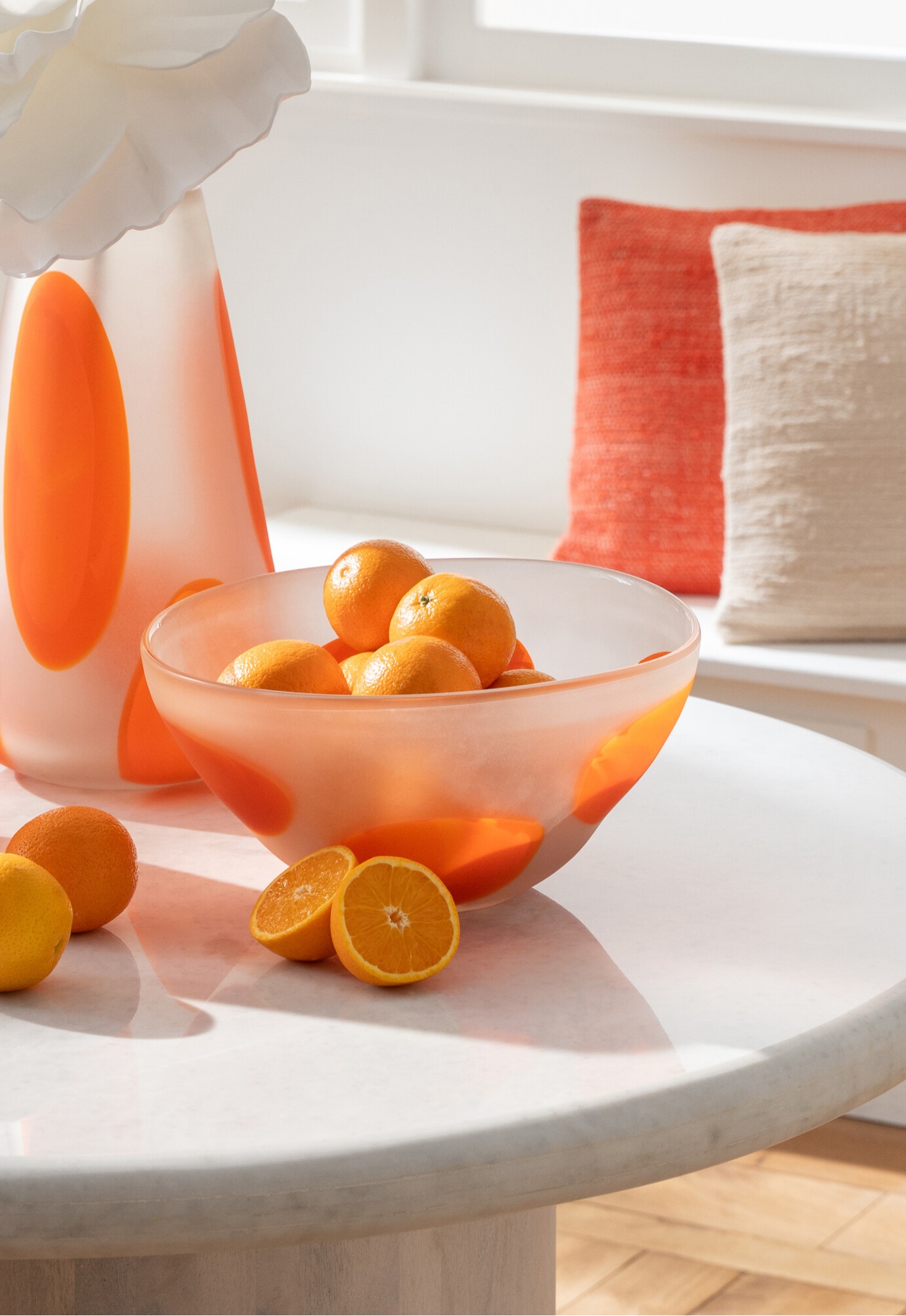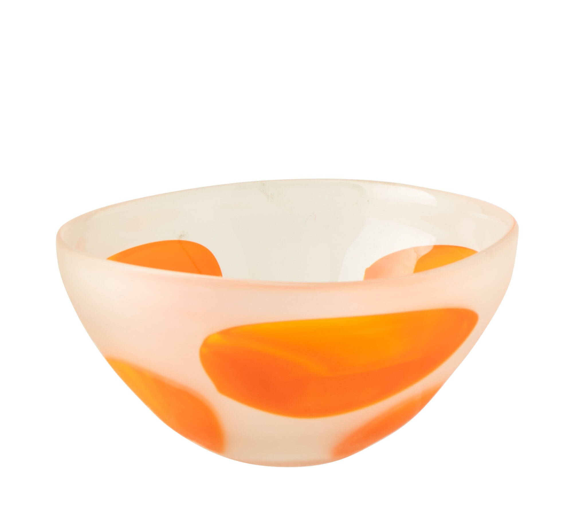 Deze prachtige sierschaal in mat glas met donkeroranje glasvlekken is een echte blikvanger 🍊✨. De oranje accenten lijken als het ware gesmolten in het glas, wat zorgt voor een uniek en artistiek effect.