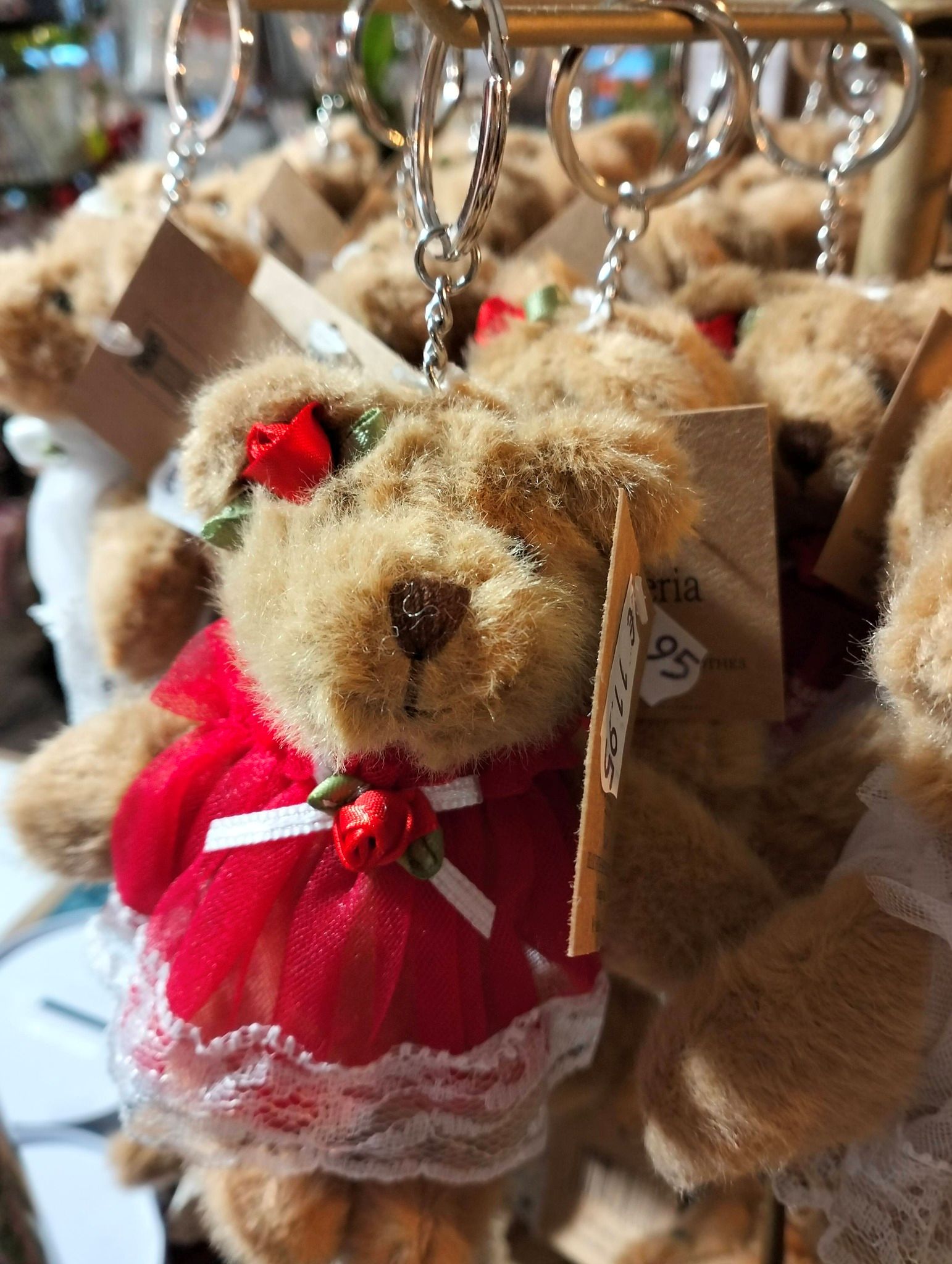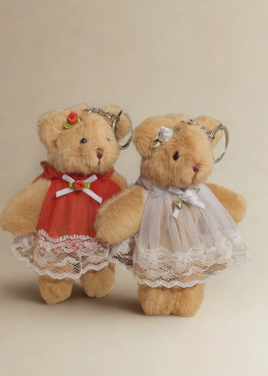 Dit assortiment van twee schattige sleutelhangers bestaat uit pluche beertjes, elk gekleed in een zorgvuldig afgewerkt jurkje: één in wit en één in rood. Een charmant accessoire dat zowel kinderen als volwassenen aanspreekt en perfect is om dagelijks bij je te dragen.