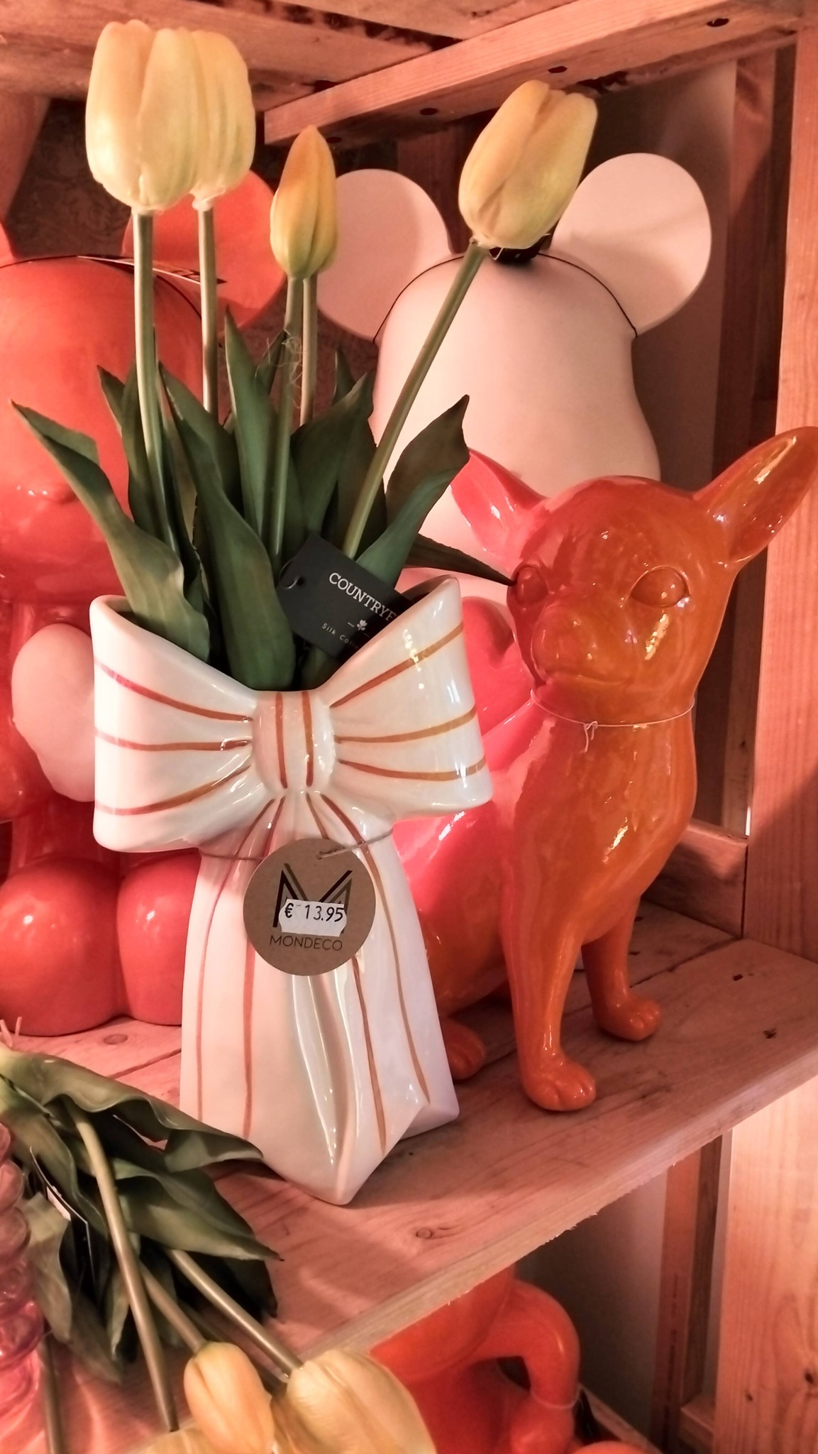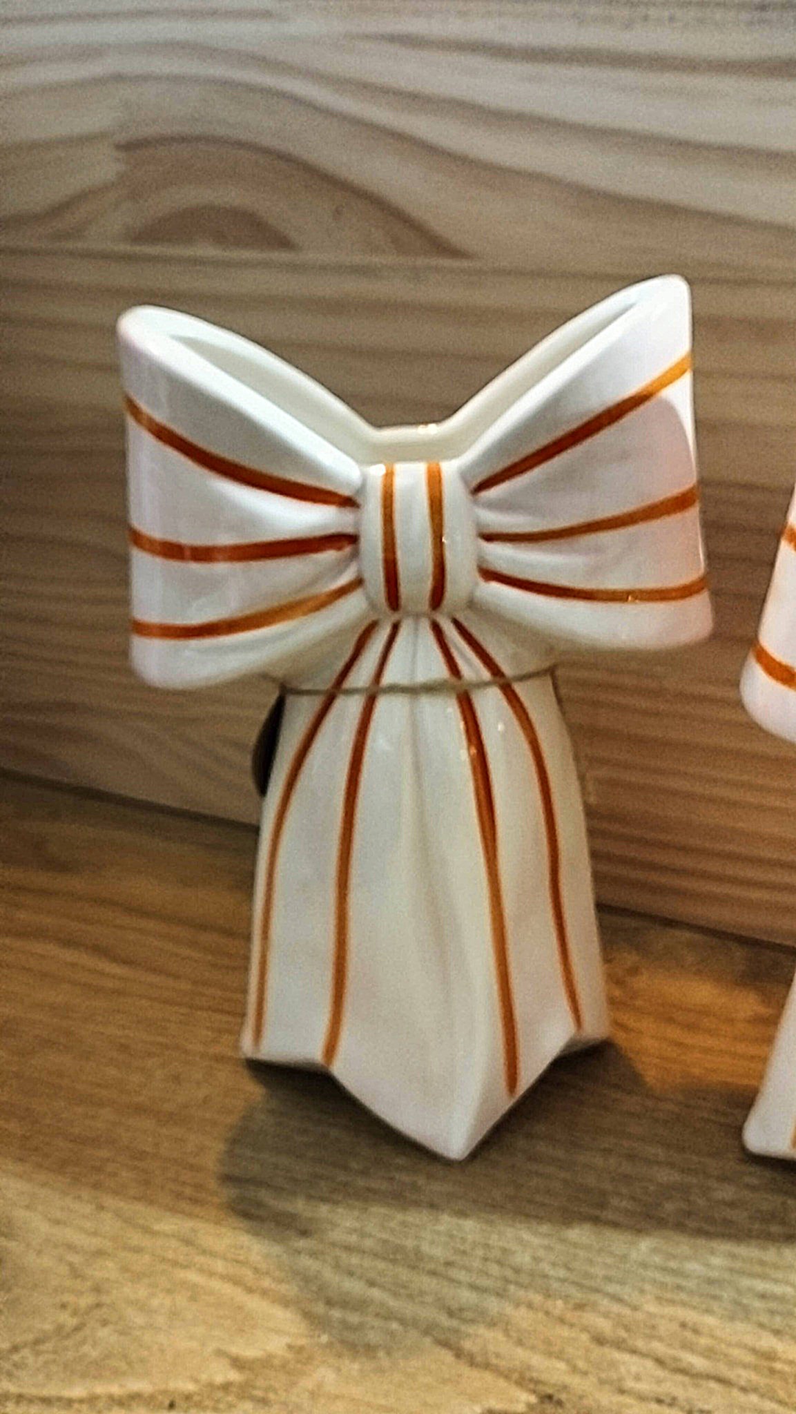 Breng een speelse en stijlvolle touch in je interieur met deze unieke strik vaas van Mondeco. De opvallende vorm in de vorm van een elegante strik, gecombineerd met een zachte roze kleur en subtiele oranje strepen, maakt deze vaas een echte eyecatcher in elke ruimte.