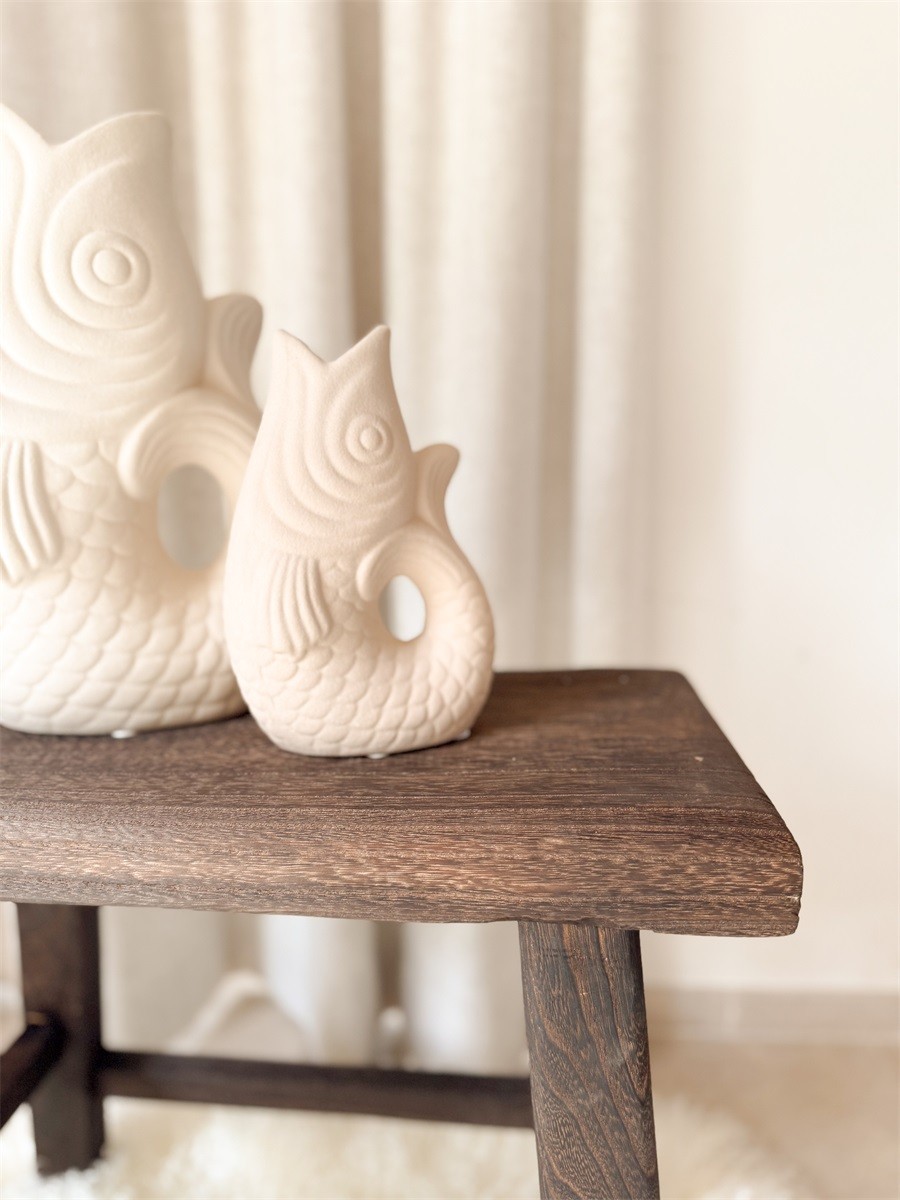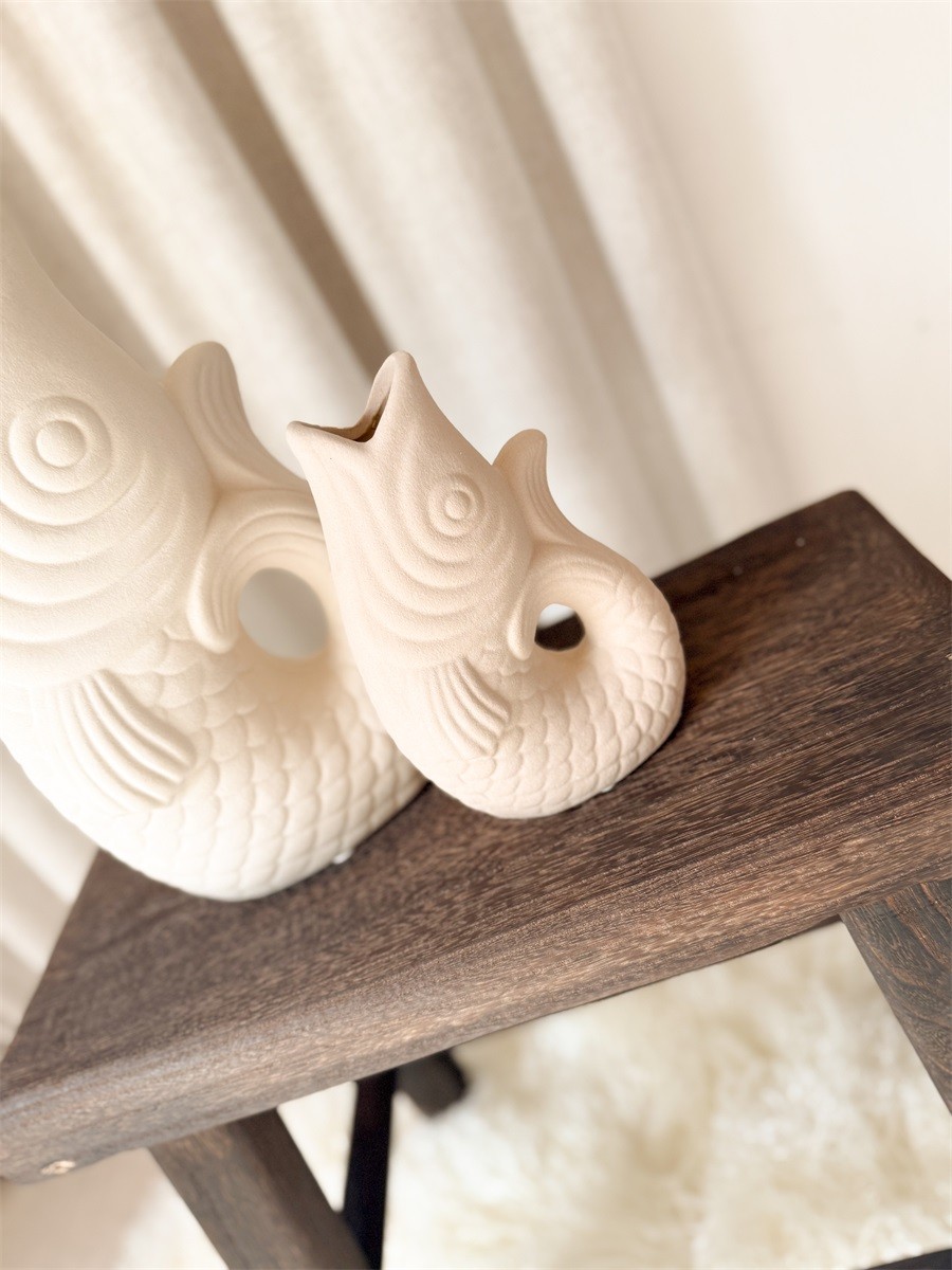 Geef je interieur een speelse en stijlvolle touch met deze unieke visvormige vaas van Mondeco. Het elegante ontwerp en de zachte beige kleur zorgen voor een rustige, natuurlijke uitstraling die perfect past in elk interieur.