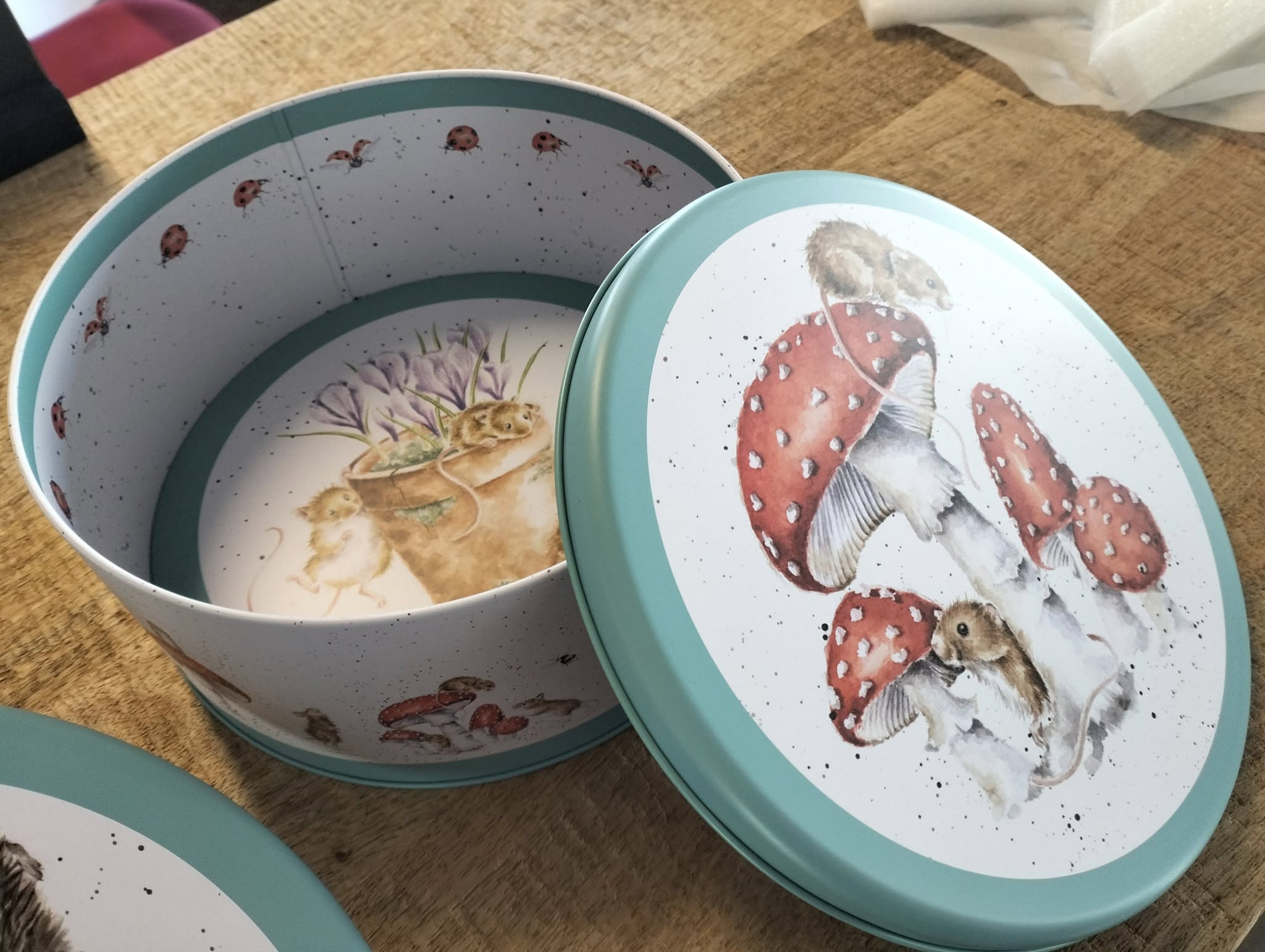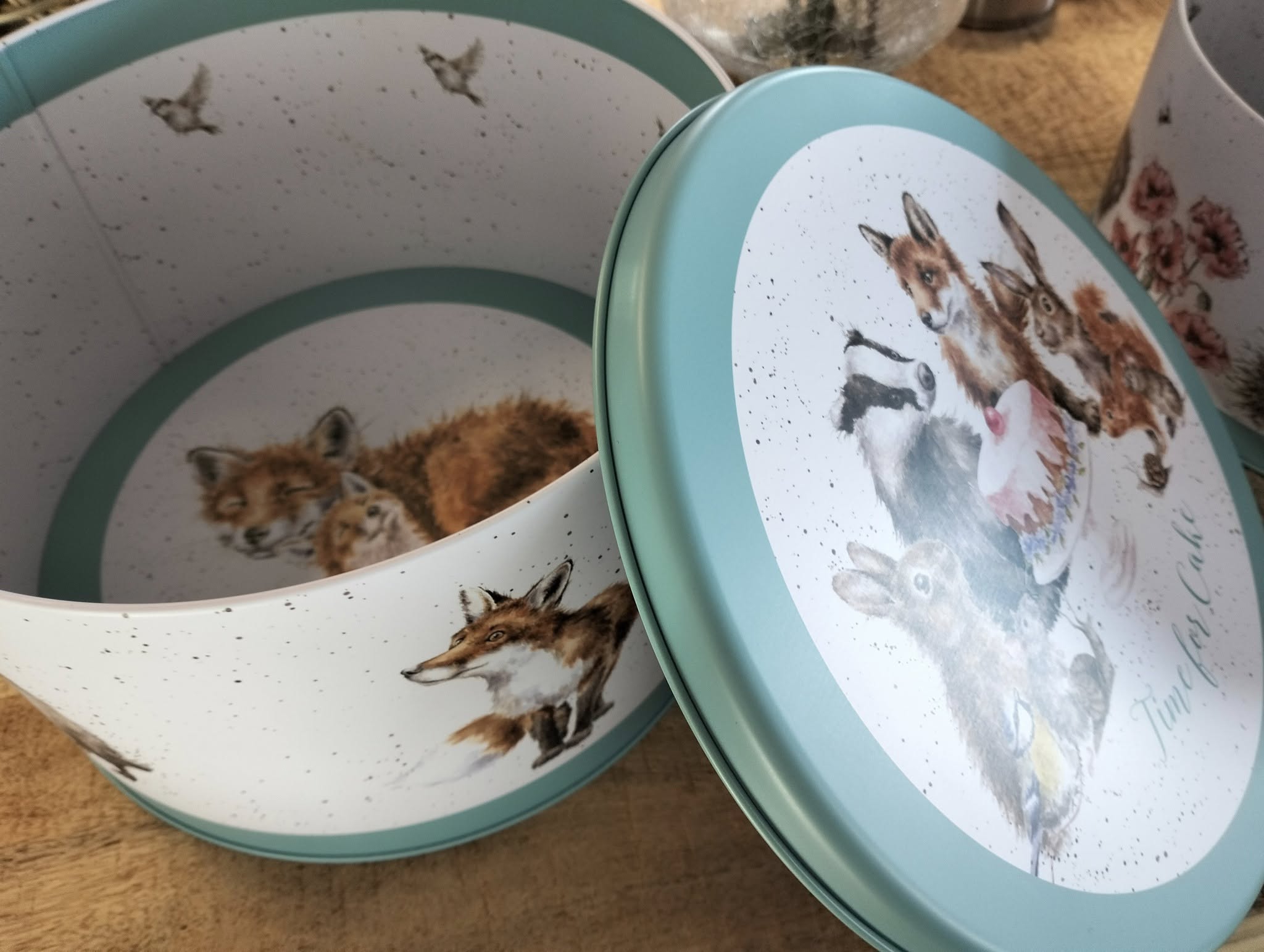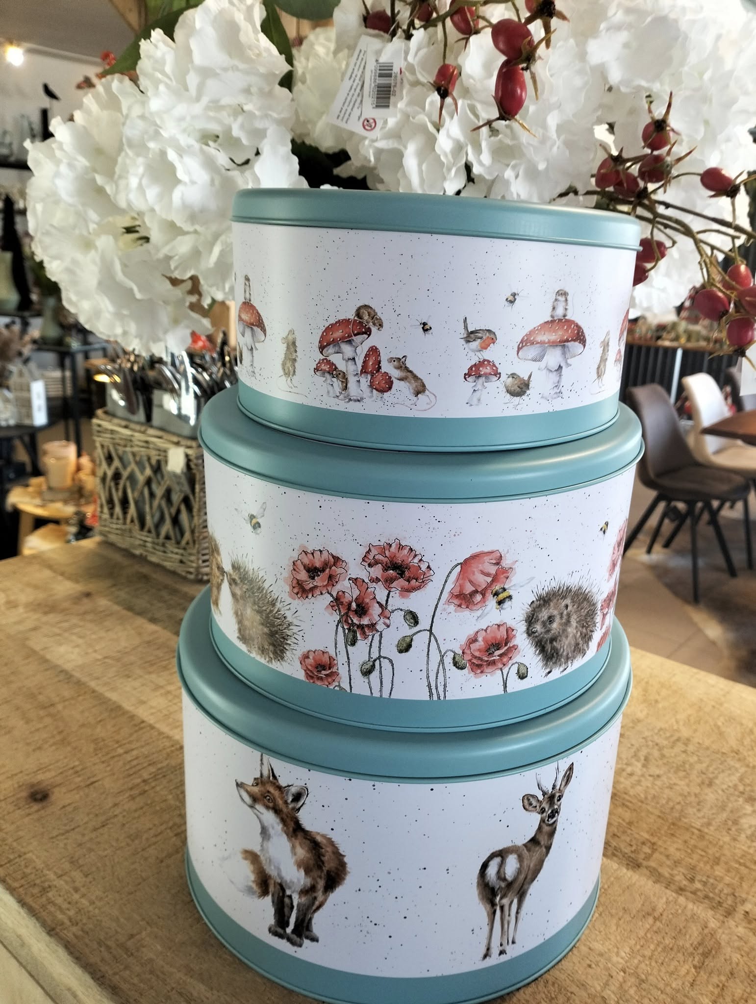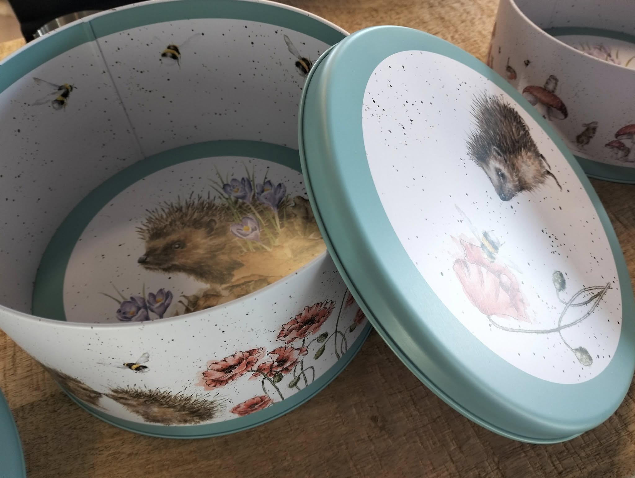 Prachtige set van drie ronde metalen voorraadblikken van Wrendale Designs, elk versierd met sfeervolle illustraties van paddenstoelen, vossen en egels uit The Country Set-collectie. Afgewerkt met een stijlvolle teal-kleurige rand en geïllustreerd op alle zijden. Ideaal voor het bewaren van taarten, koekjes of andere baksels, én een perfect cadeau voor bakliefhebbers.
