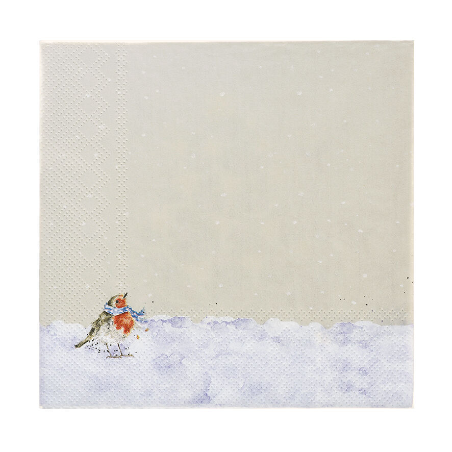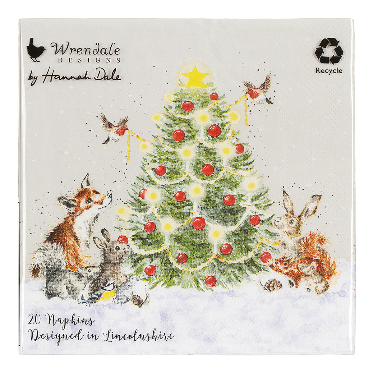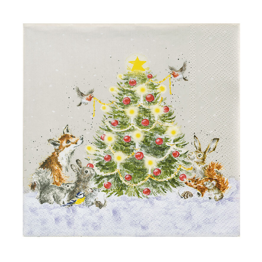 Set van 20 luxe, driedelige papieren servetten van Wrendale Designs, voorzien van de sfeervolle Oh Christmas Tree-illustratie van Hannah Dale. Het tafereel toont bosdieren die toekijken terwijl twee roodborstjes de kerstboom versieren. Gedetailleerd geschilderd in zachte waterverftinten, tegen een subtiele taupe achtergrond.